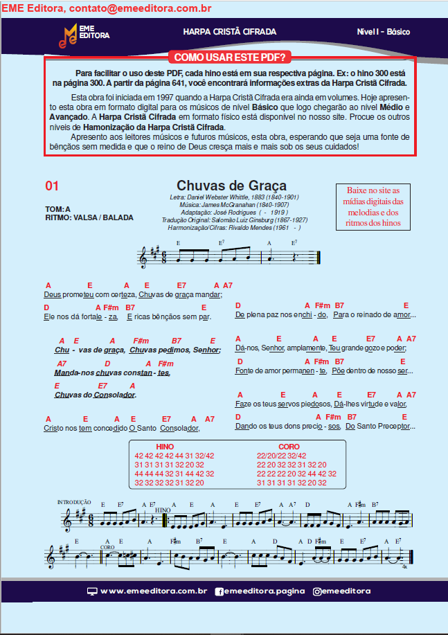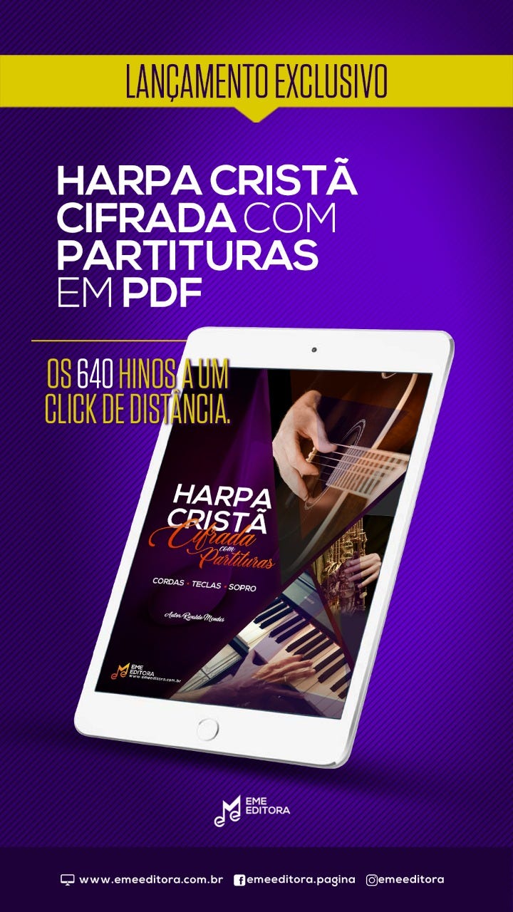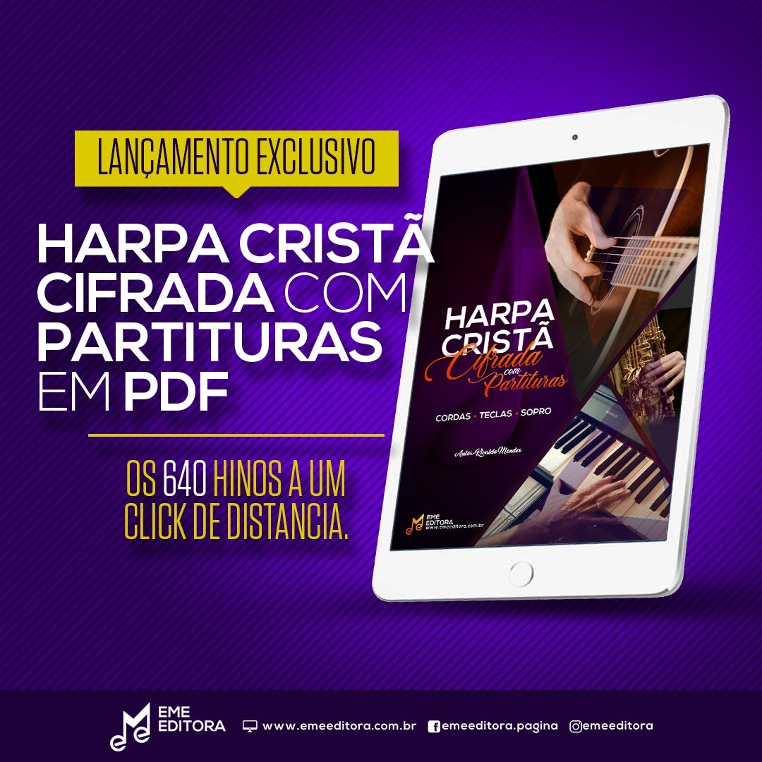 A Harpa Cristã online, em formato PDF da Editora EME é uma realidade. São 640 hinos cifrados, facilitados e muitos deles transportados para tonalidades mais baixas. Um fantástico trabalho do professor Rivaldo Mendes, criador da Harpa Cristã Cifrada. Desde 1994, esta publicação é um sucesso didático no Brasil e no exterior e agora vem facilitar o acesso do povo de Deus, que ainda deseja tocar os consagrados Hinos da Harpa Cristã. E por um preço inacreditável!